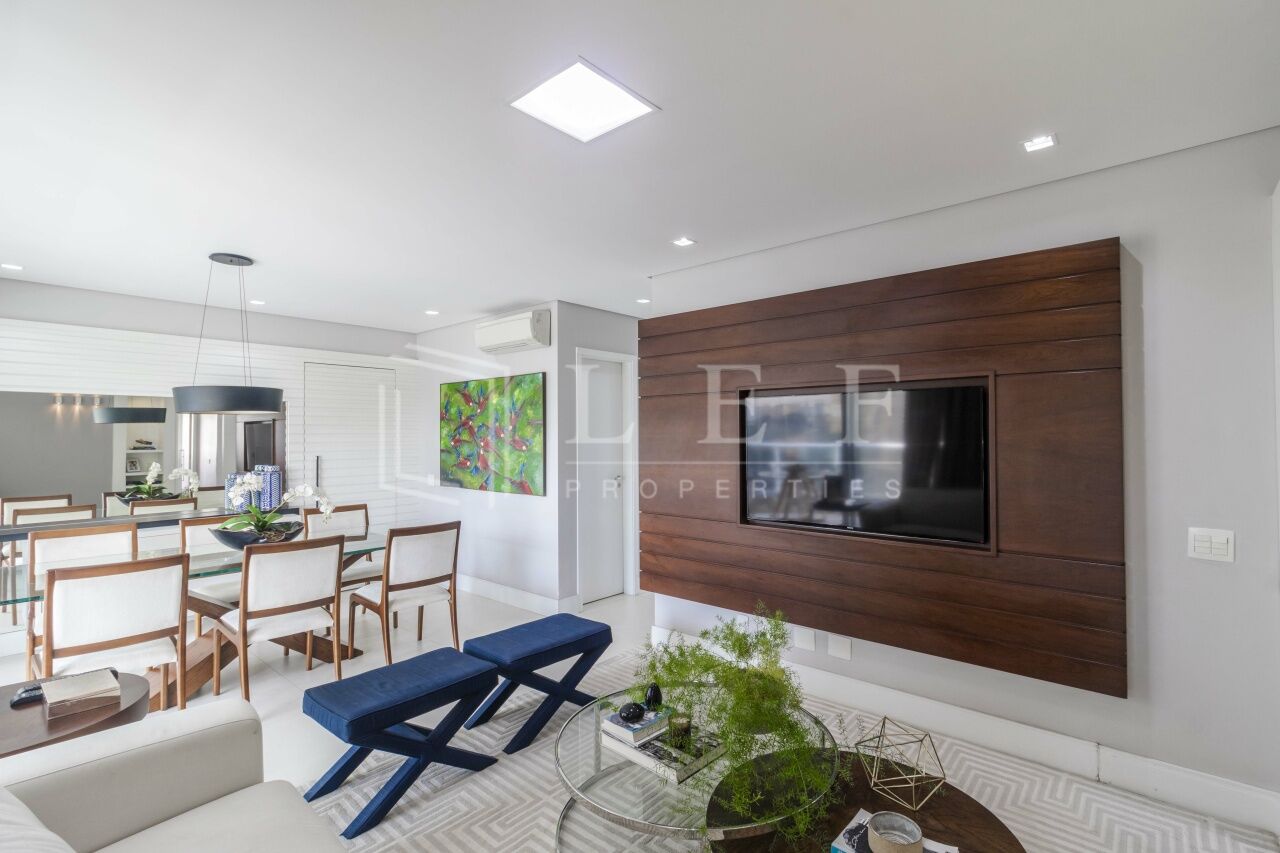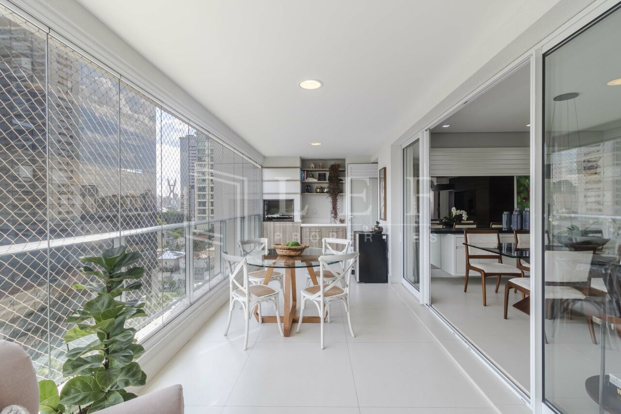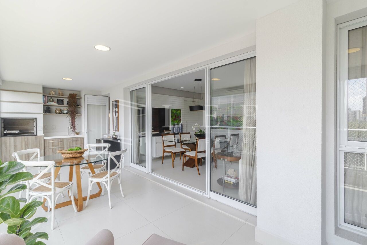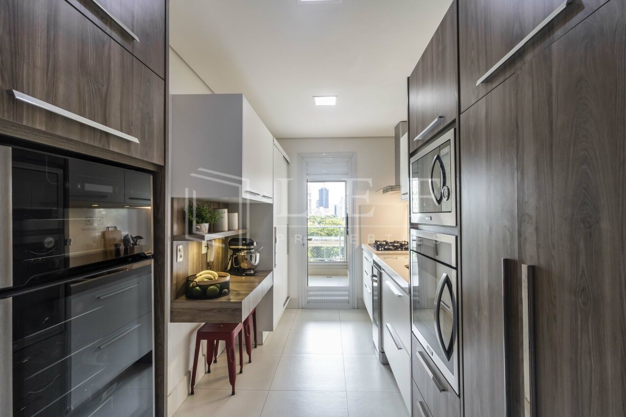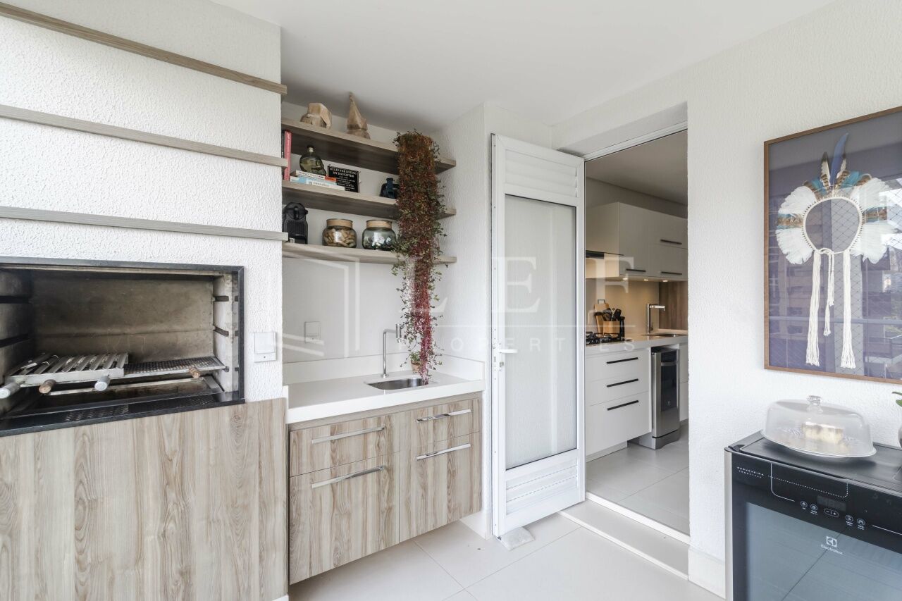 Possui móveis planejados de alta qualidade, ar condicionado em todos os ambientes, sala integrada com varanda gourmet e churrasqueira também integrada a cozinha, lavabo, cozinha repleta de armários, área de serviço completa com despensa, são 2 vagas de garagem + depósito privativo.