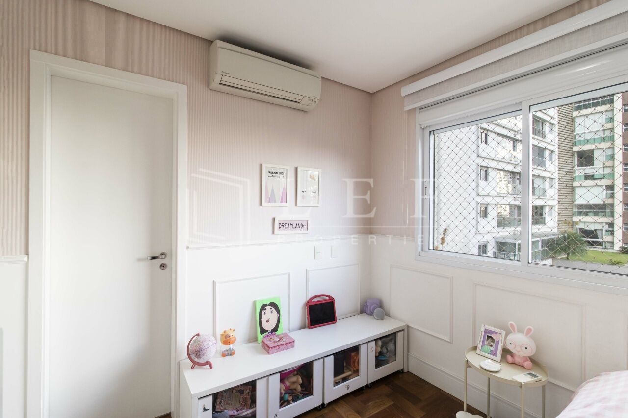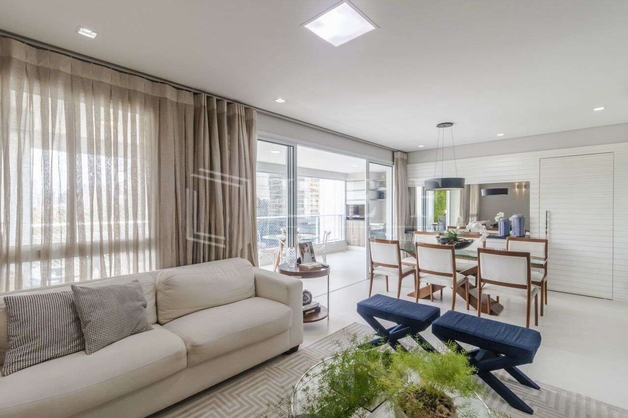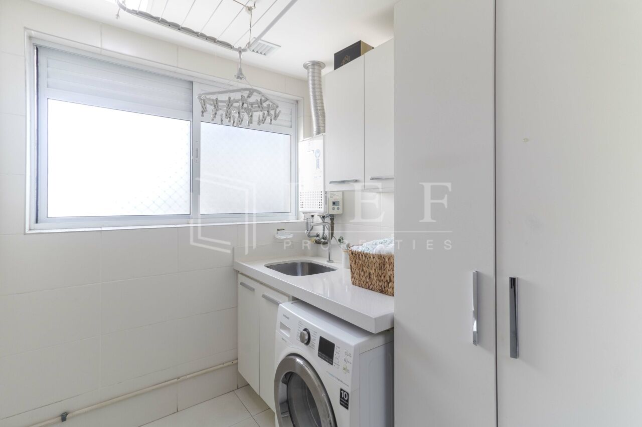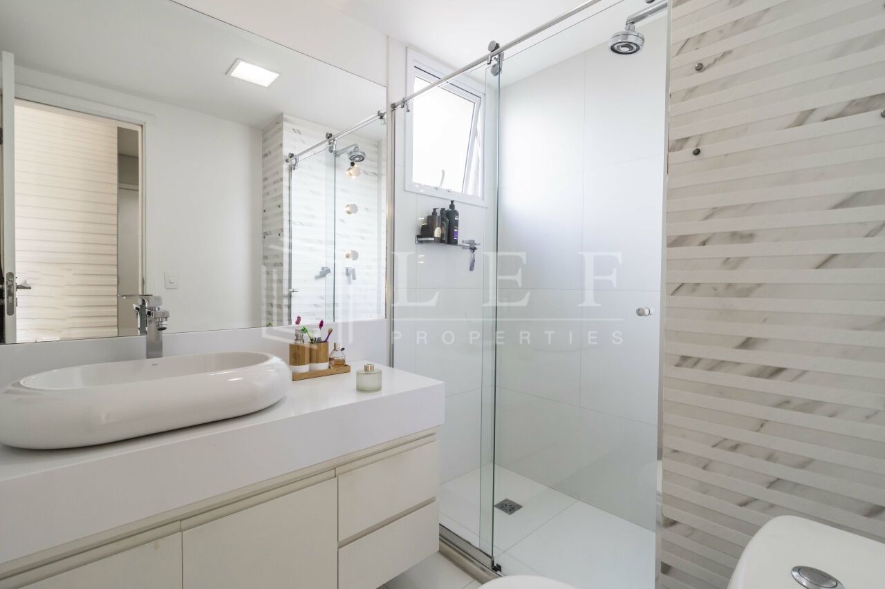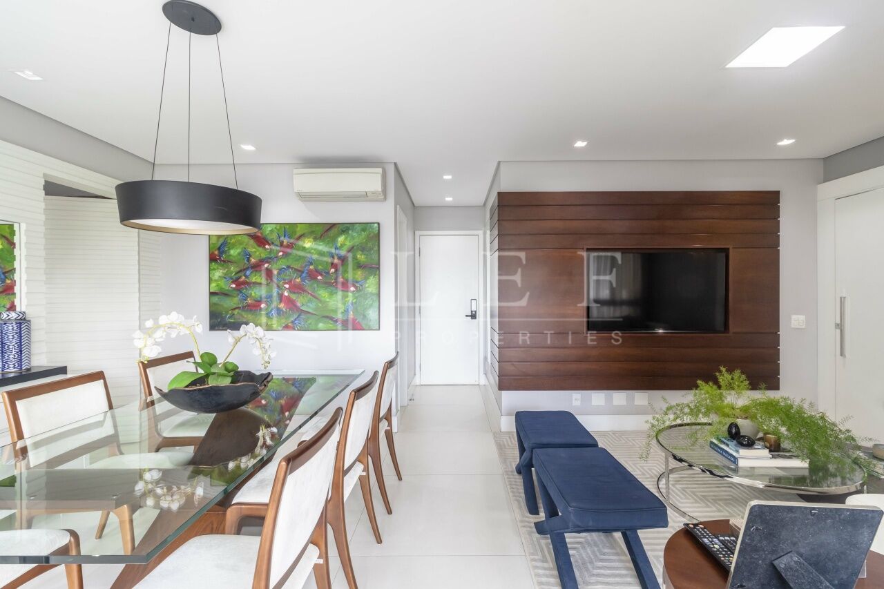 Possui móveis planejados de alta qualidade, ar condicionado em todos os ambientes, sala integrada com varanda gourmet e churrasqueira também integrada a cozinha, lavabo, cozinha repleta de armários, área de serviço completa com despensa, são 2 vagas de garagem + depósito privativo.