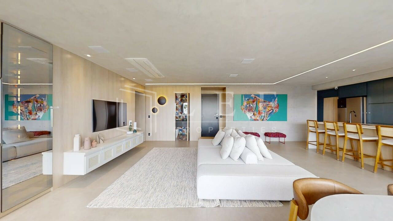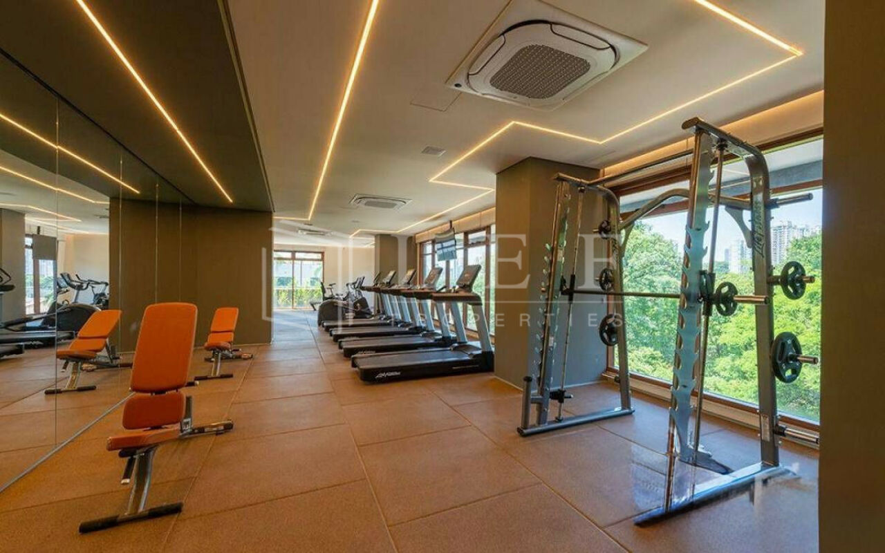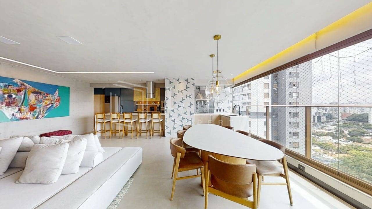 Este apartamento de 147 m² no Condomínio Stella Campo Belo combina projeto assinado, automação completa e um design sofisticado em cada detalhe. A sala em três ambientes integra estar, TV e gourmet com perfeito equilíbrio, enquanto a cozinha americana apresenta cristaleira, adega climatizada e eletros de alto padrão. O escritório oferece privacidade total, e a área de serviço traz soluções modernas, como varal automatizado. São três suítes confortáveis, incluindo uma master impecável, com super closet simétrico, penteadeira e um banheiro revestido em pedras naturais Hijau, equipado com chuveiro de teto e janelas acústicas. O apartamento conta com móveis planejados em Nogueira Florida, painéis mimetizados que ocultam portas, sofá automatizado tipo ilha e uma mesa de jantar orgânica assinada. A varanda gourmet possui churrasqueira a gás com coifa inox e exaustor próprio. A tecnologia é um diferencial: som ambiente, Alexia integradas, rede cabeada MESH, janelas motorizadas com sensores de chuva, rolo automatizado na varanda, iluminação indireta em todo o imóvel e duchas com mono comando.