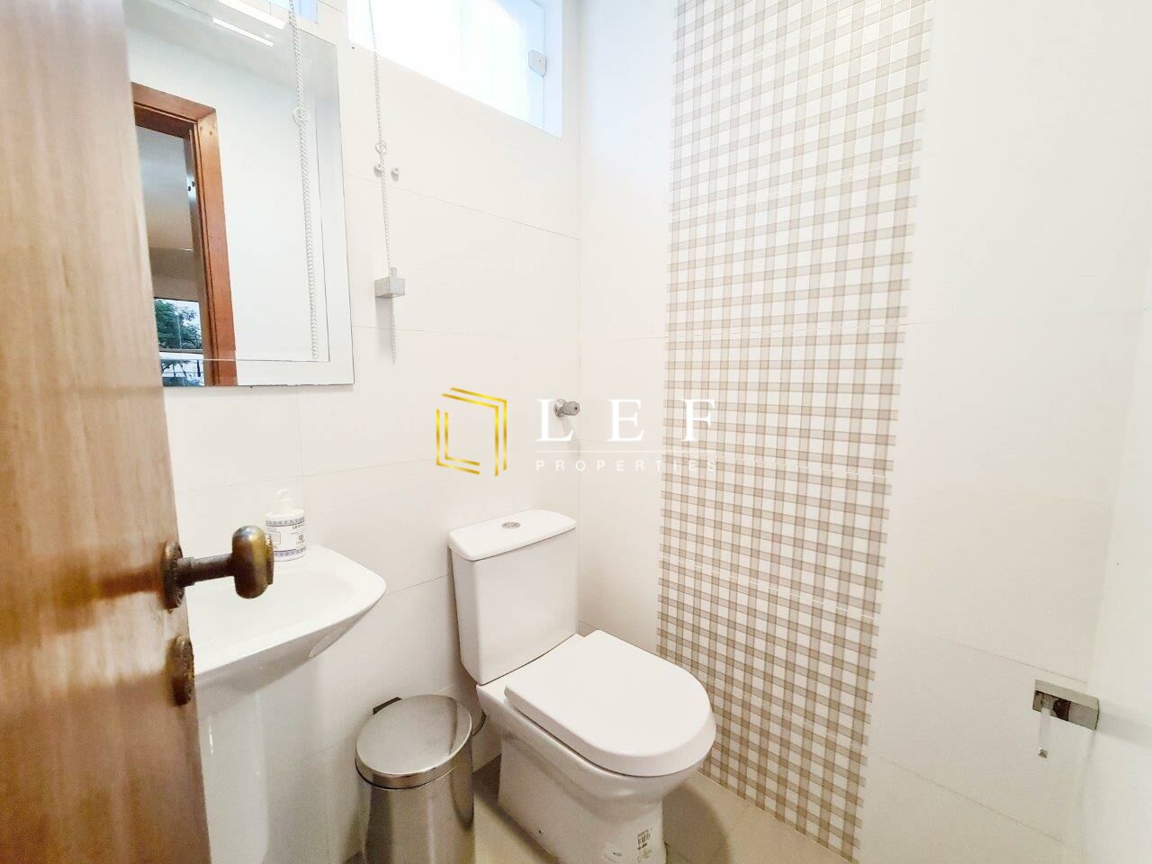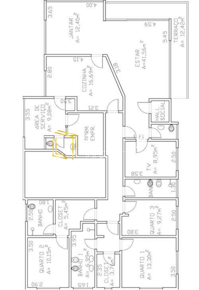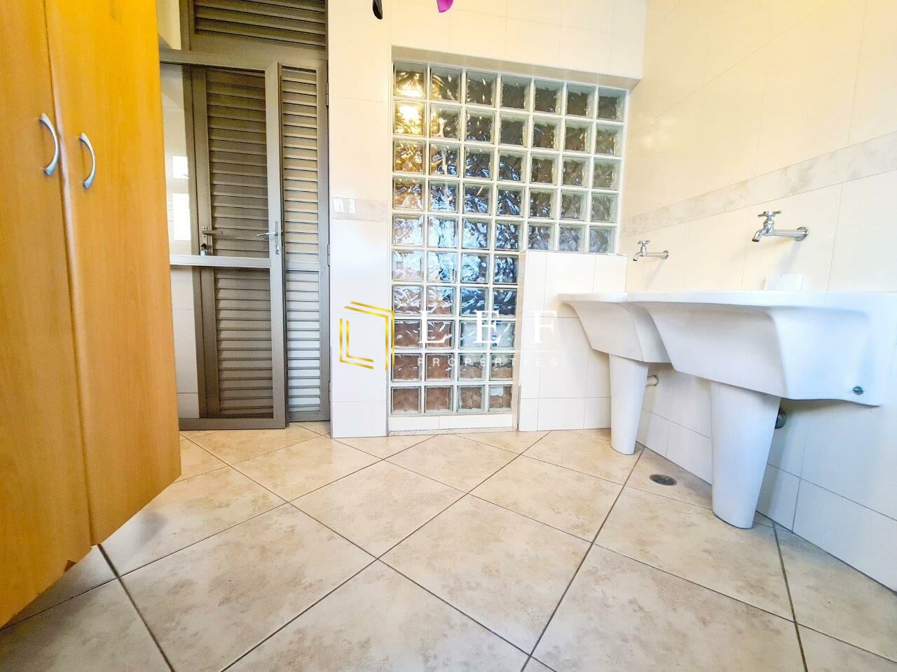 Área de serviço com banheiro de empregada sendo que o quarto foi convertido em escritório com entrada pelo corredor de distribuição dos quartos.