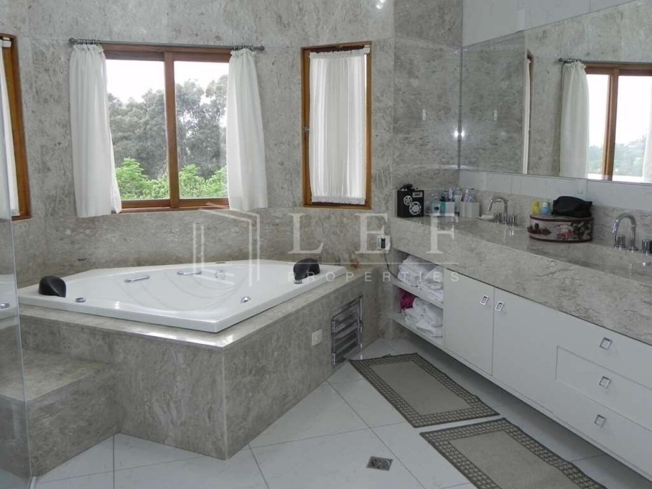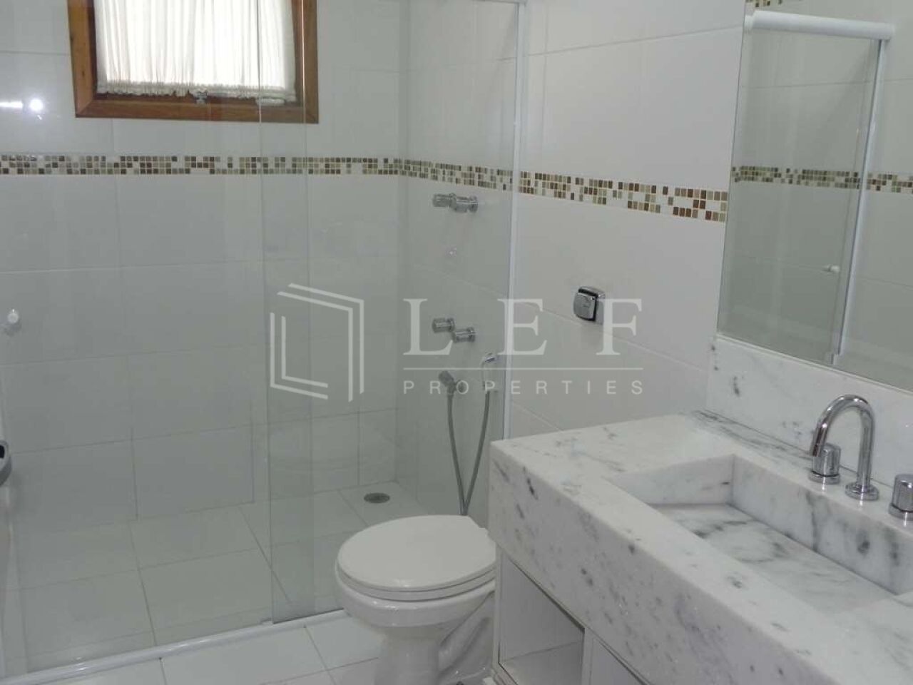 - Banheiros modernos e claros, com box de vidro e pias em mármore;