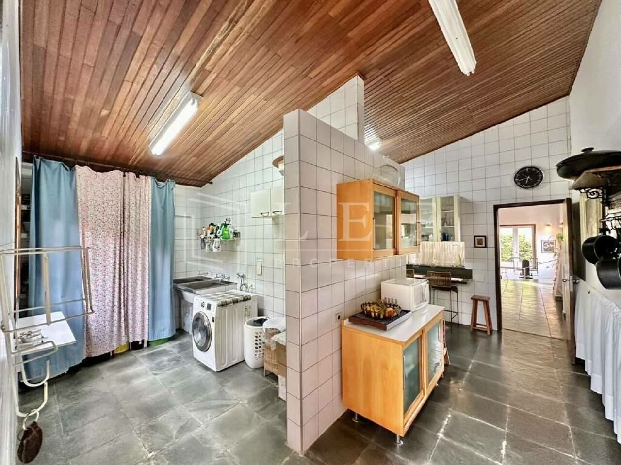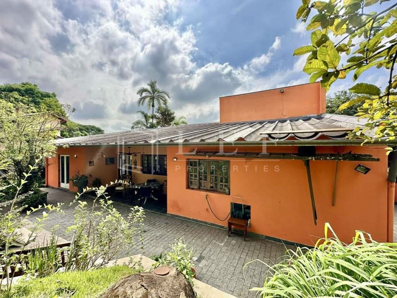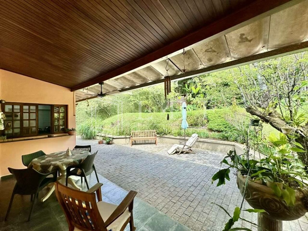 Pisos em Ardósia, revestimento de madeira e Miracema no quintal.