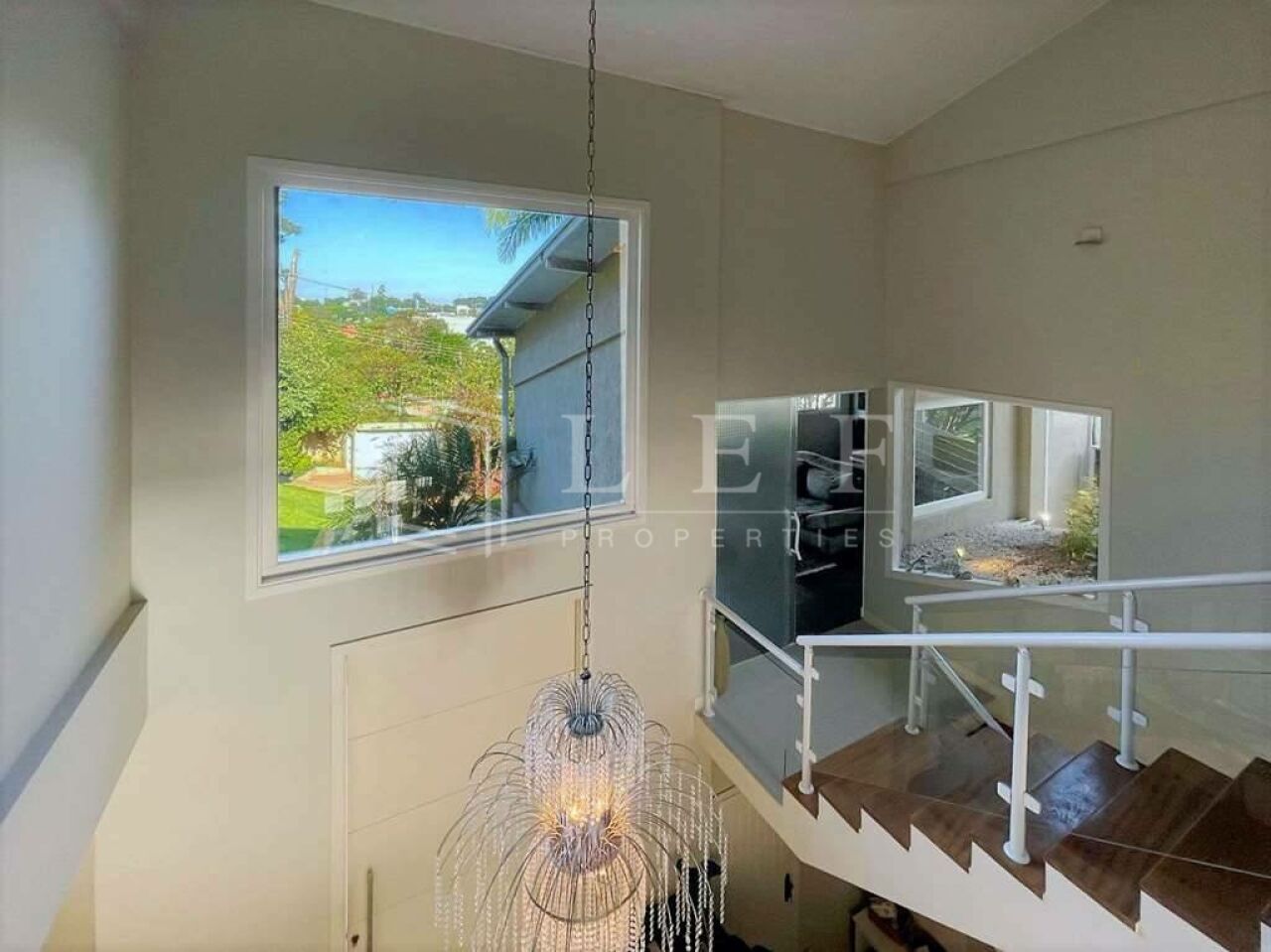 Escada de alvenaria, revestida de madeira, com guarda corpo de vidro e metal.
