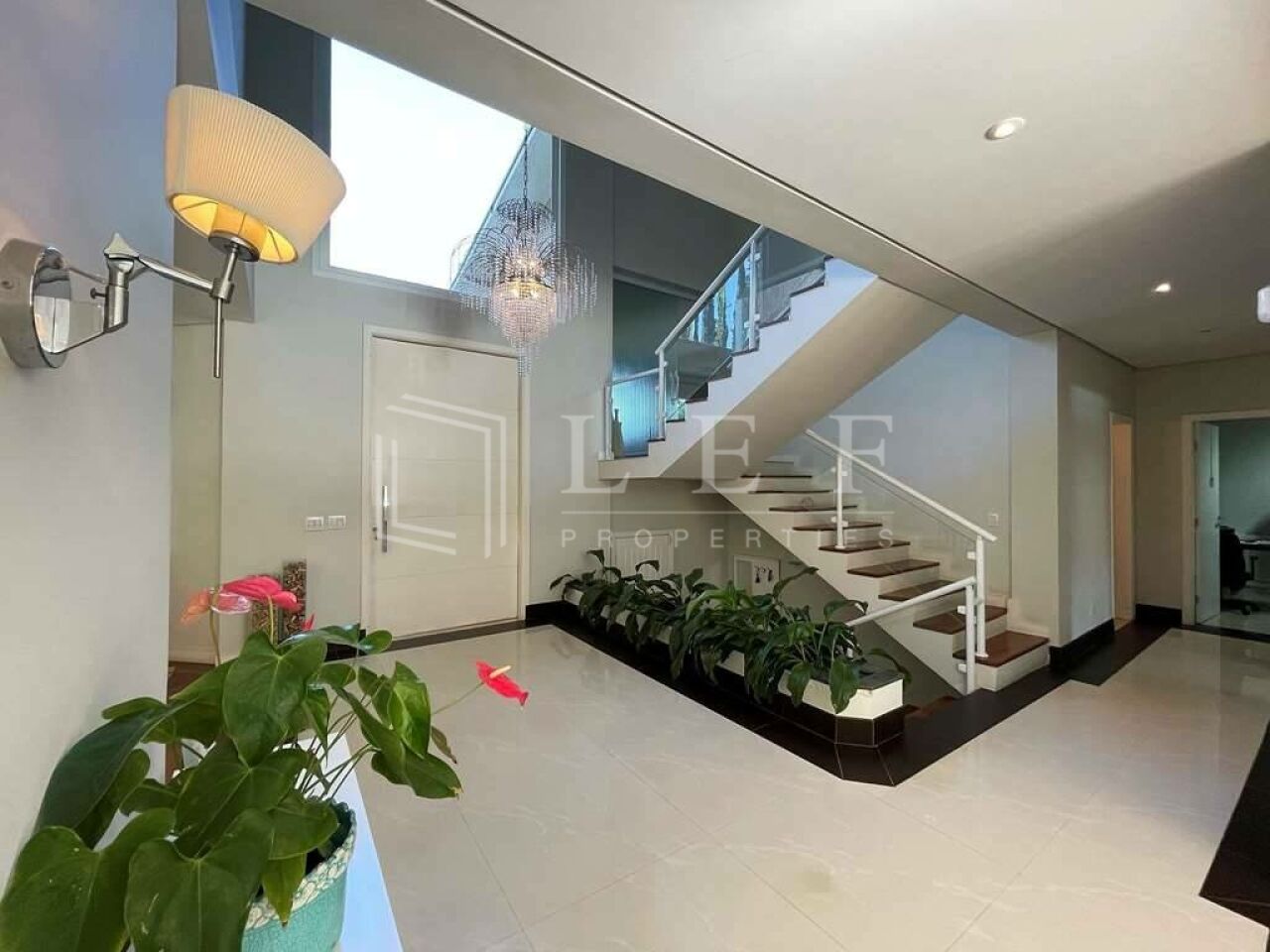 Hall de entrada social com porta pivotante e pé direito alto.