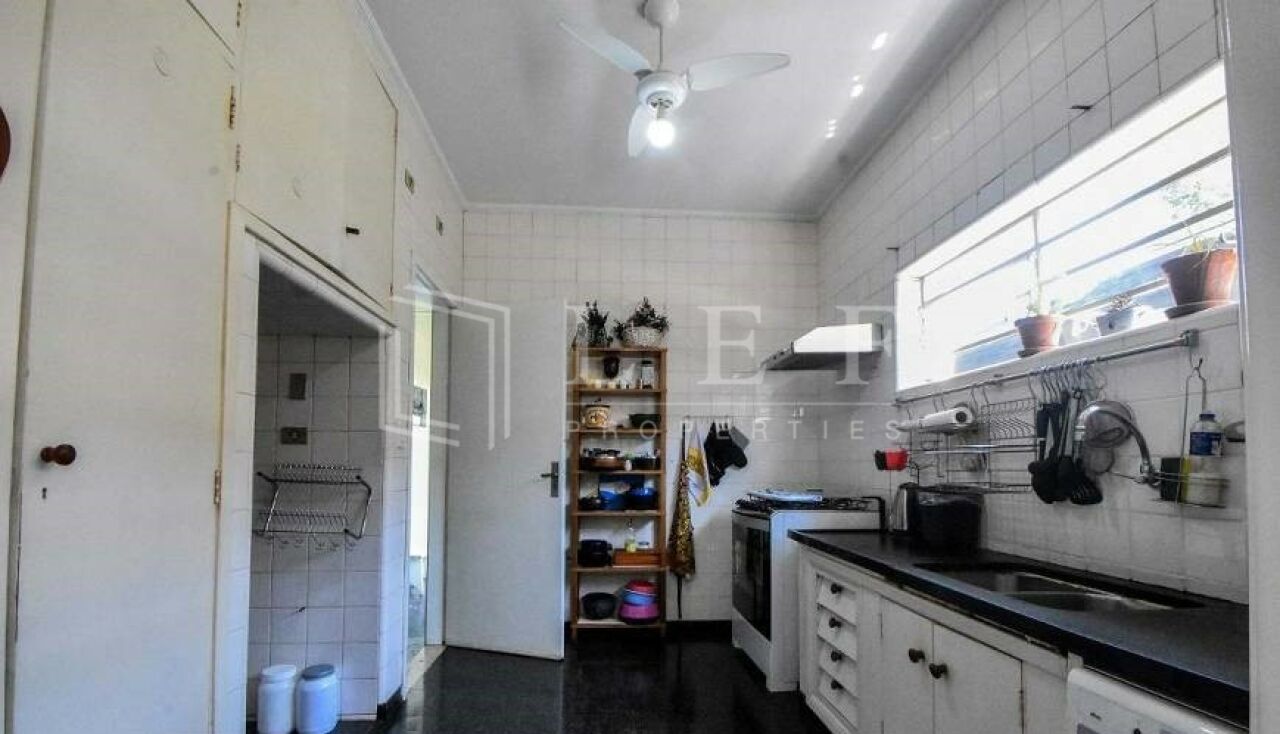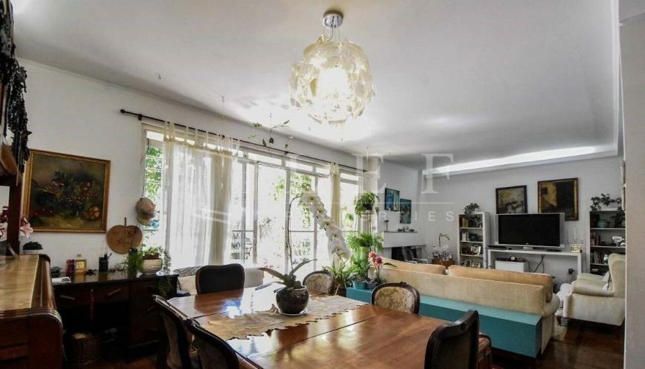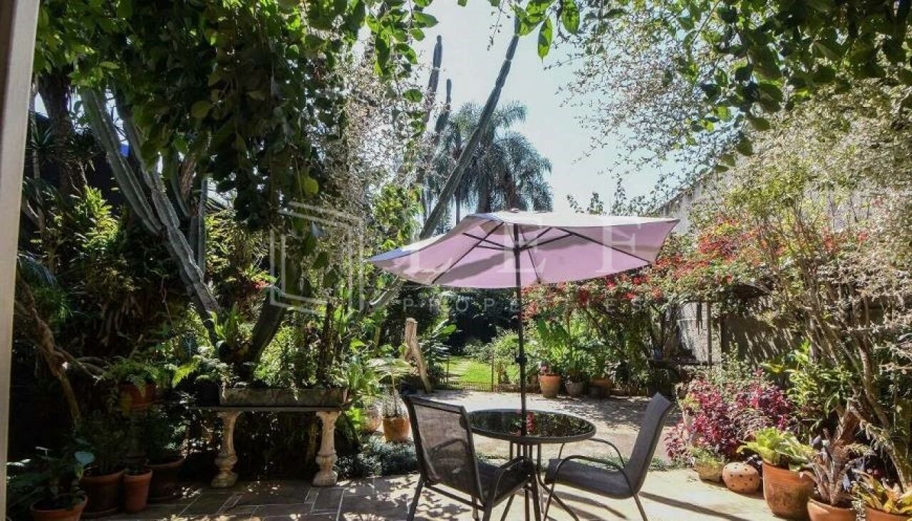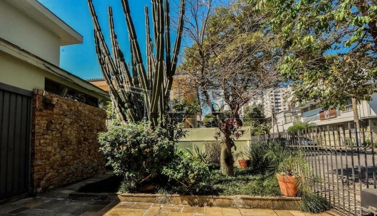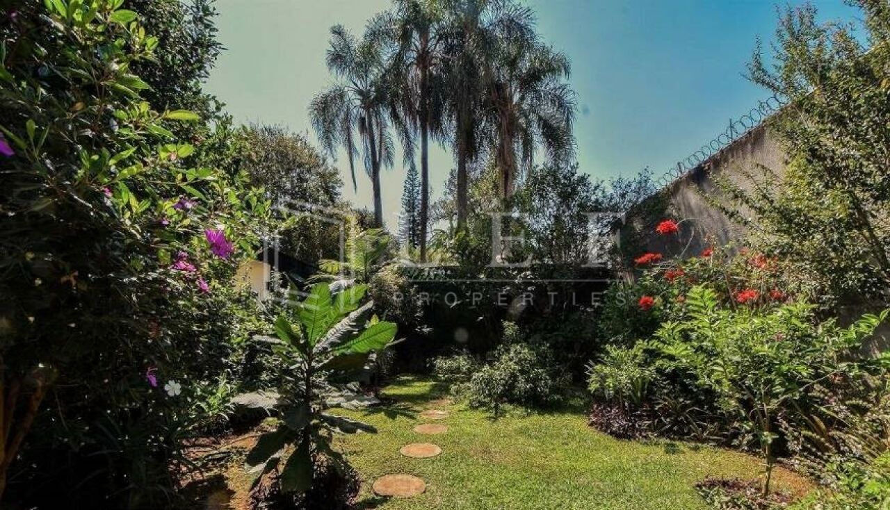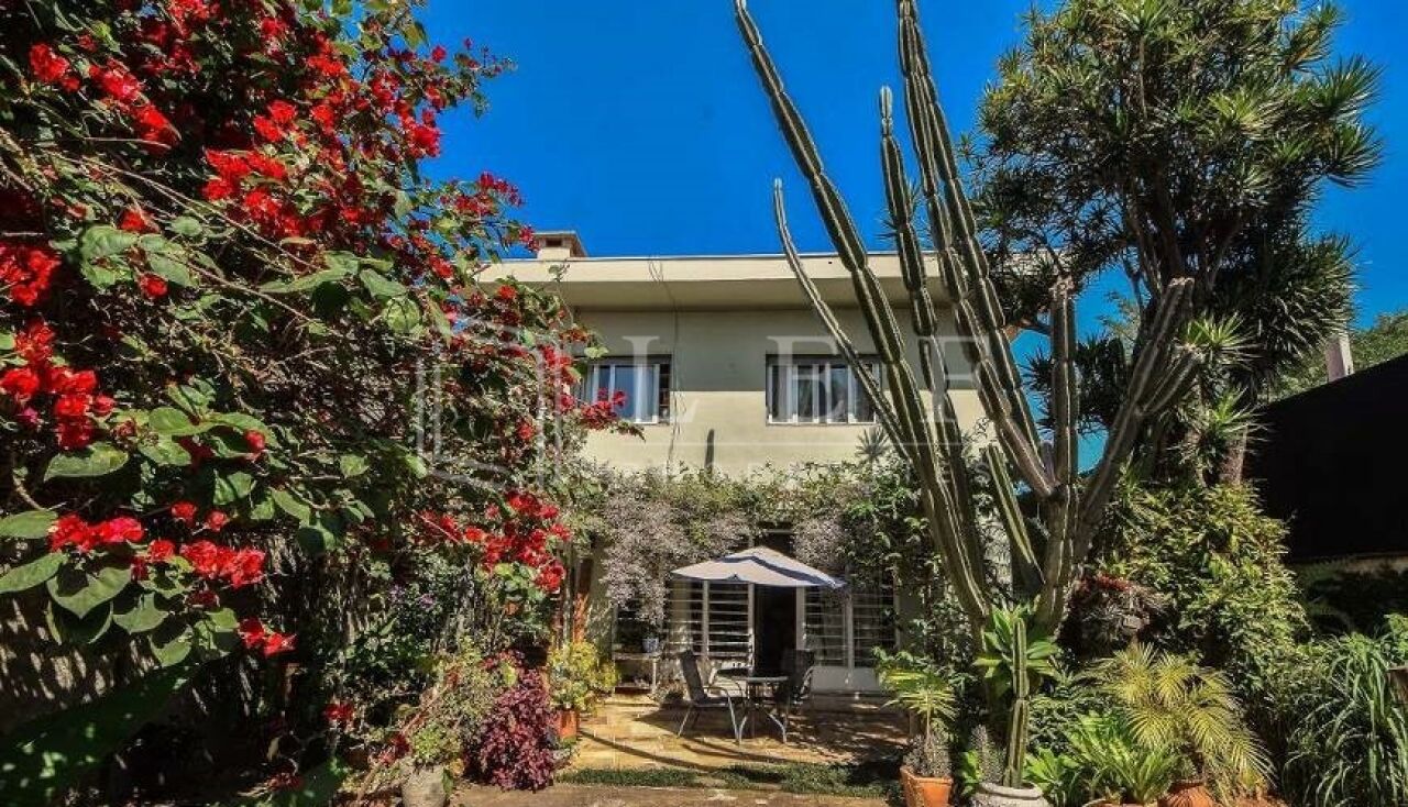 Sobrado dispõe de 5 dormitórios, sendo 2 suítes, living para 3 ambientes com lareira, lavabo, sala de jantar com acesso ao jardim, banheiro social, copa, cozinha e área de serviços, com quarto e banheiro para empregada, totalizando 370m².