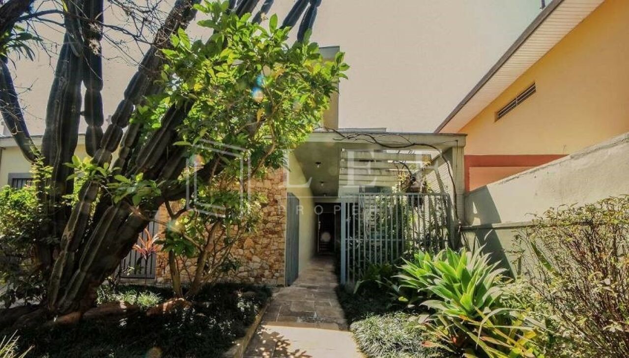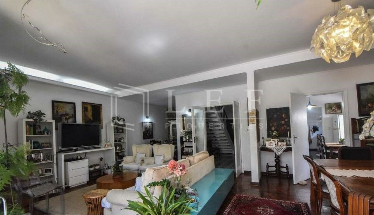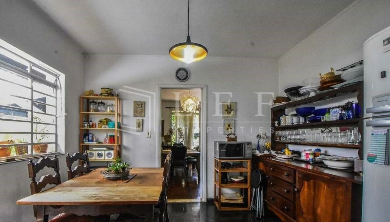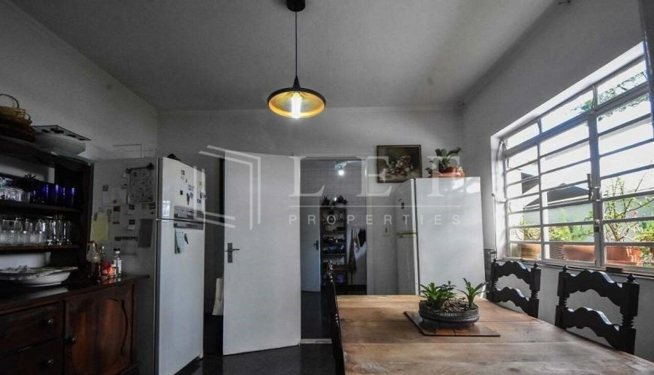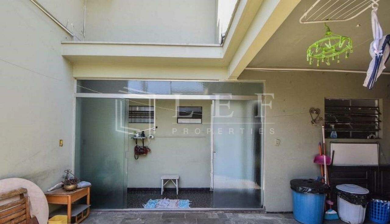 Sobrado dispõe de 5 dormitórios, sendo 2 suítes, living para 3 ambientes com lareira, lavabo, sala de jantar com acesso ao jardim, banheiro social, copa, cozinha e área de serviços, com quarto e banheiro para empregada, totalizando 370m².