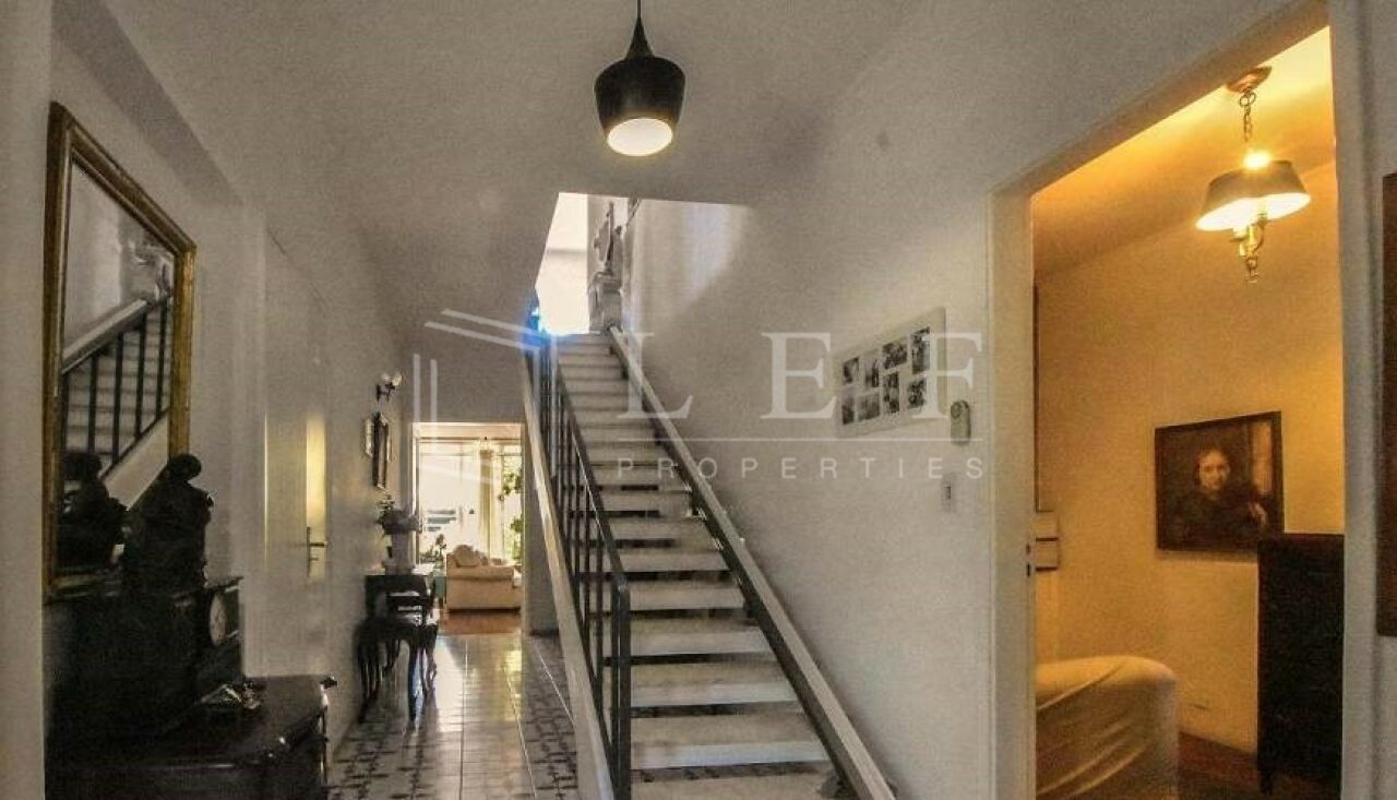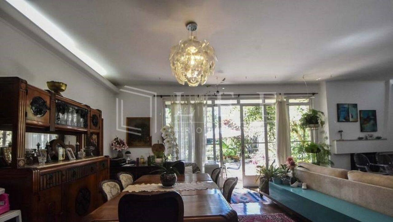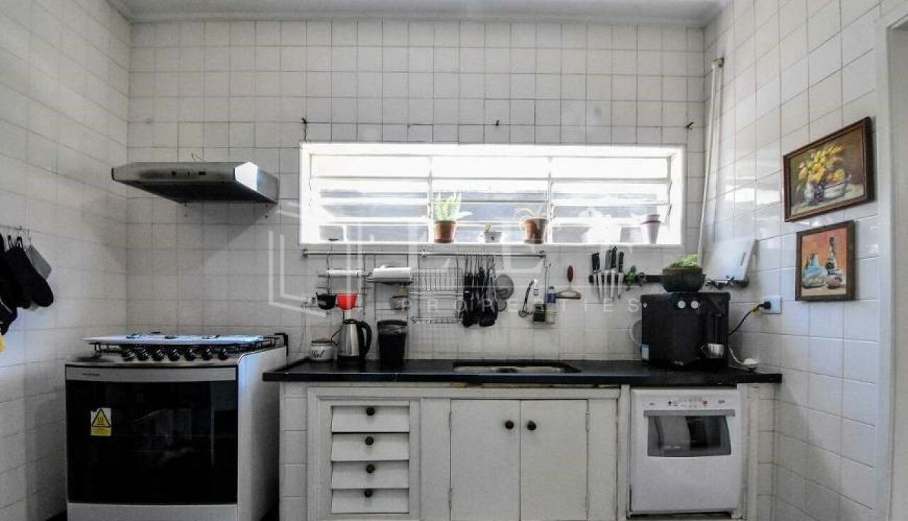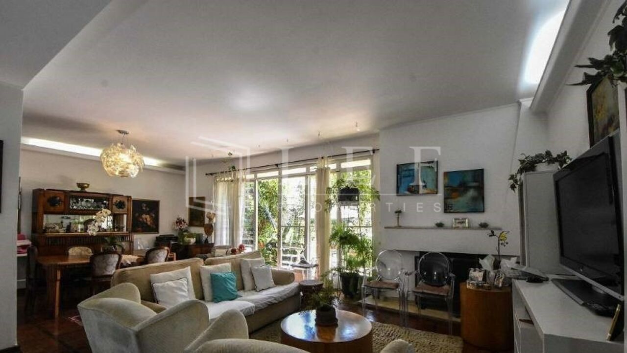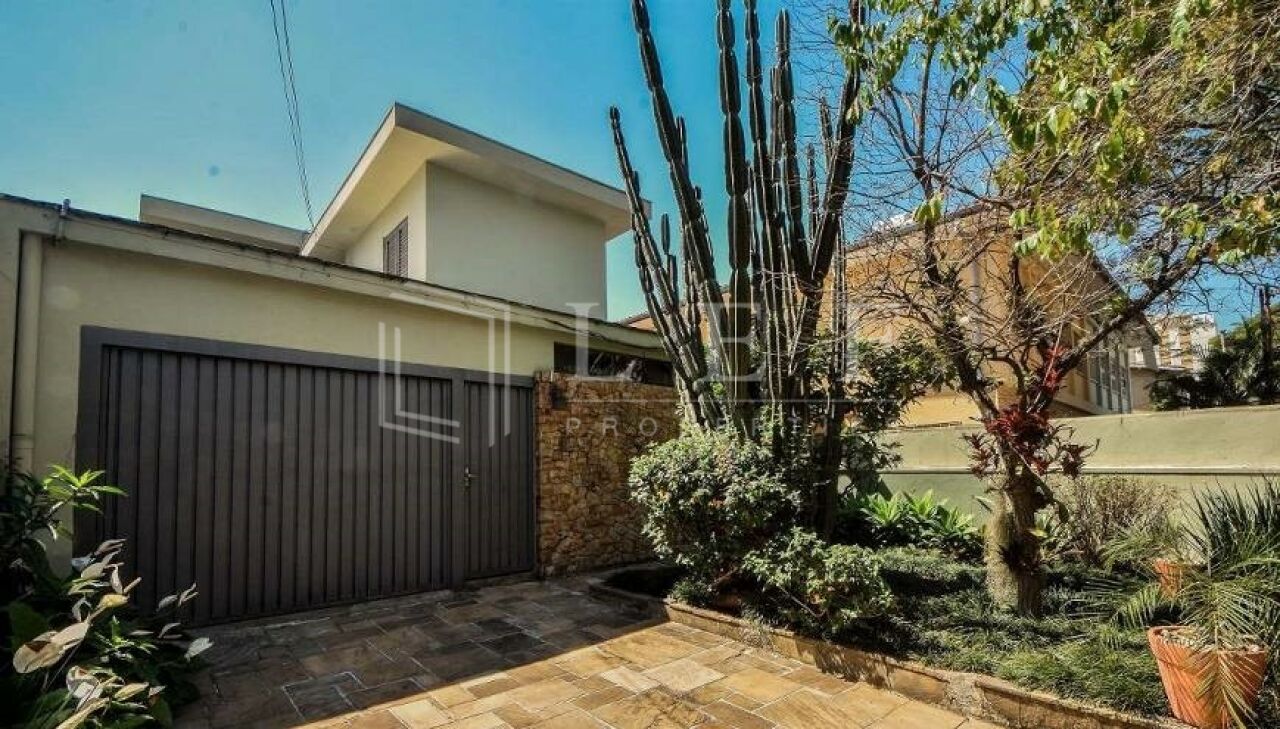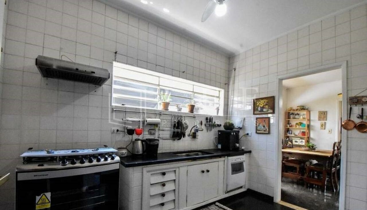 Sobrado dispõe de 5 dormitórios, sendo 2 suítes, living para 3 ambientes com lareira, lavabo, sala de jantar com acesso ao jardim, banheiro social, copa, cozinha e área de serviços, com quarto e banheiro para empregada, totalizando 370m².