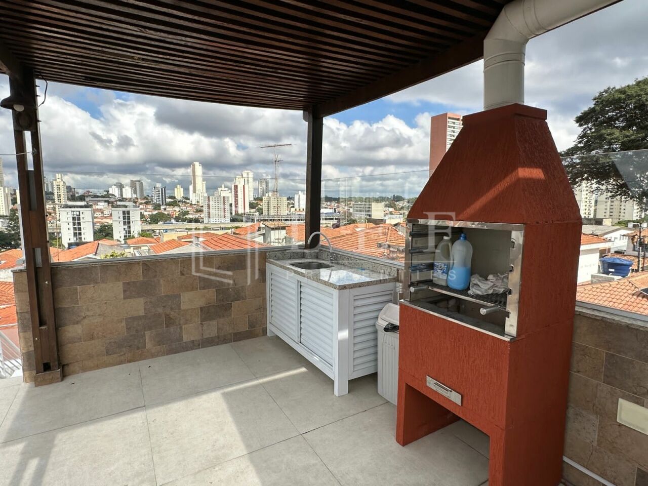 Solarium superior com área gourmet, churrasqueira, grande espaço com vista livre.