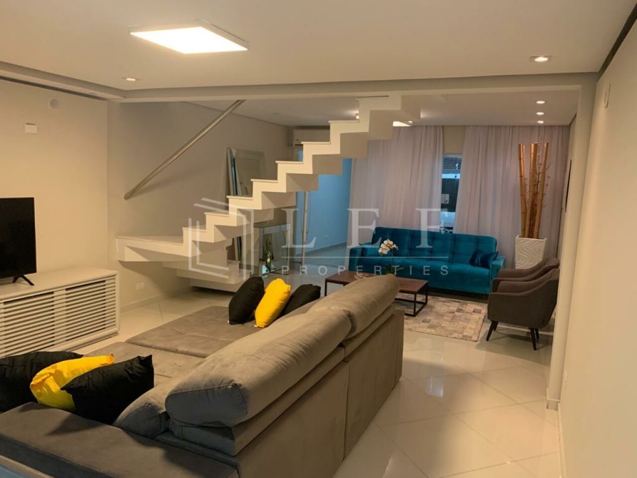 Térreo: 2 vagas de garagem, sala de TV, Sala de estar, Sala de jantar, banheiro, cozinha e vão livre com vista para os andares;