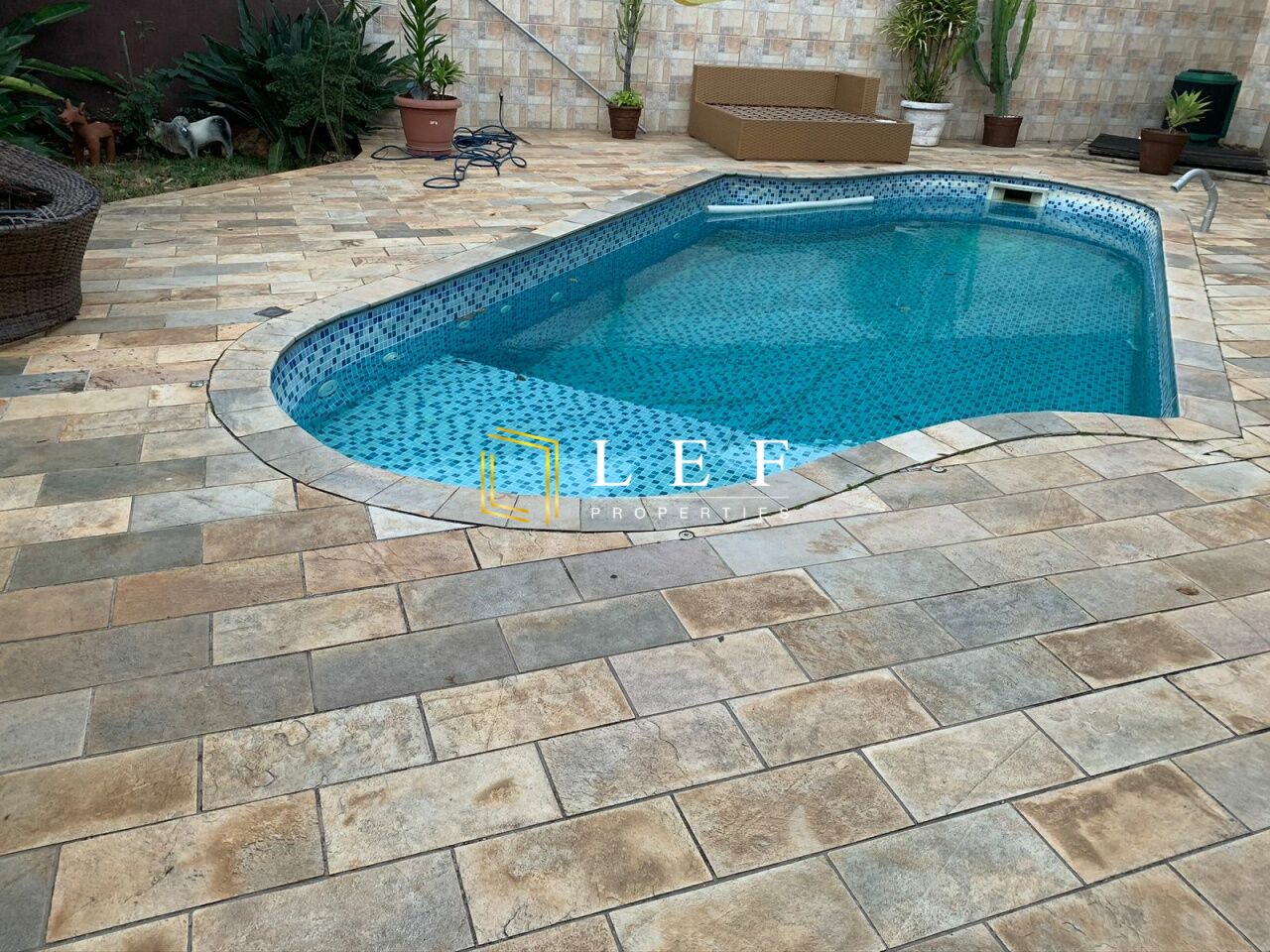 Área externa dispõe de 6 vagas de garagem, piscina, churrasqueira, jardim e quintal.