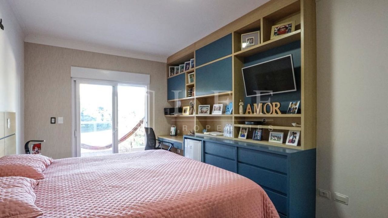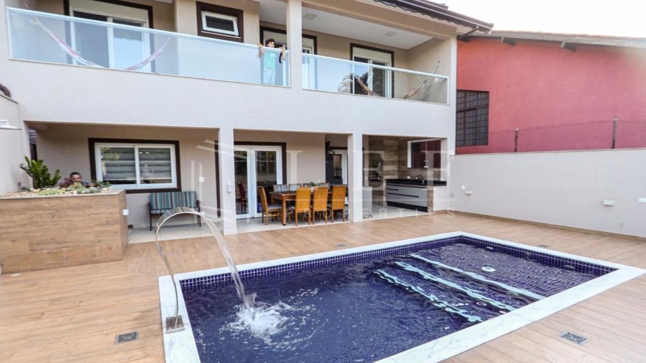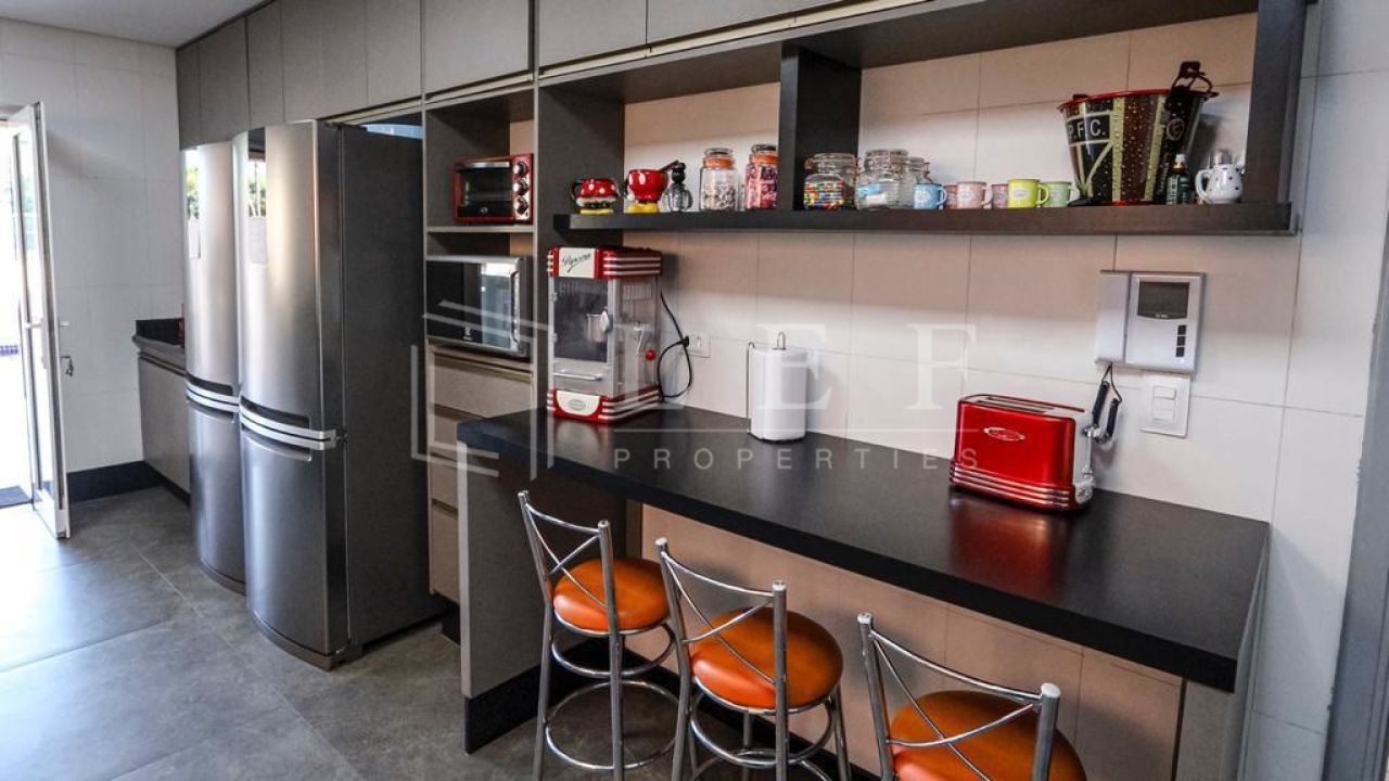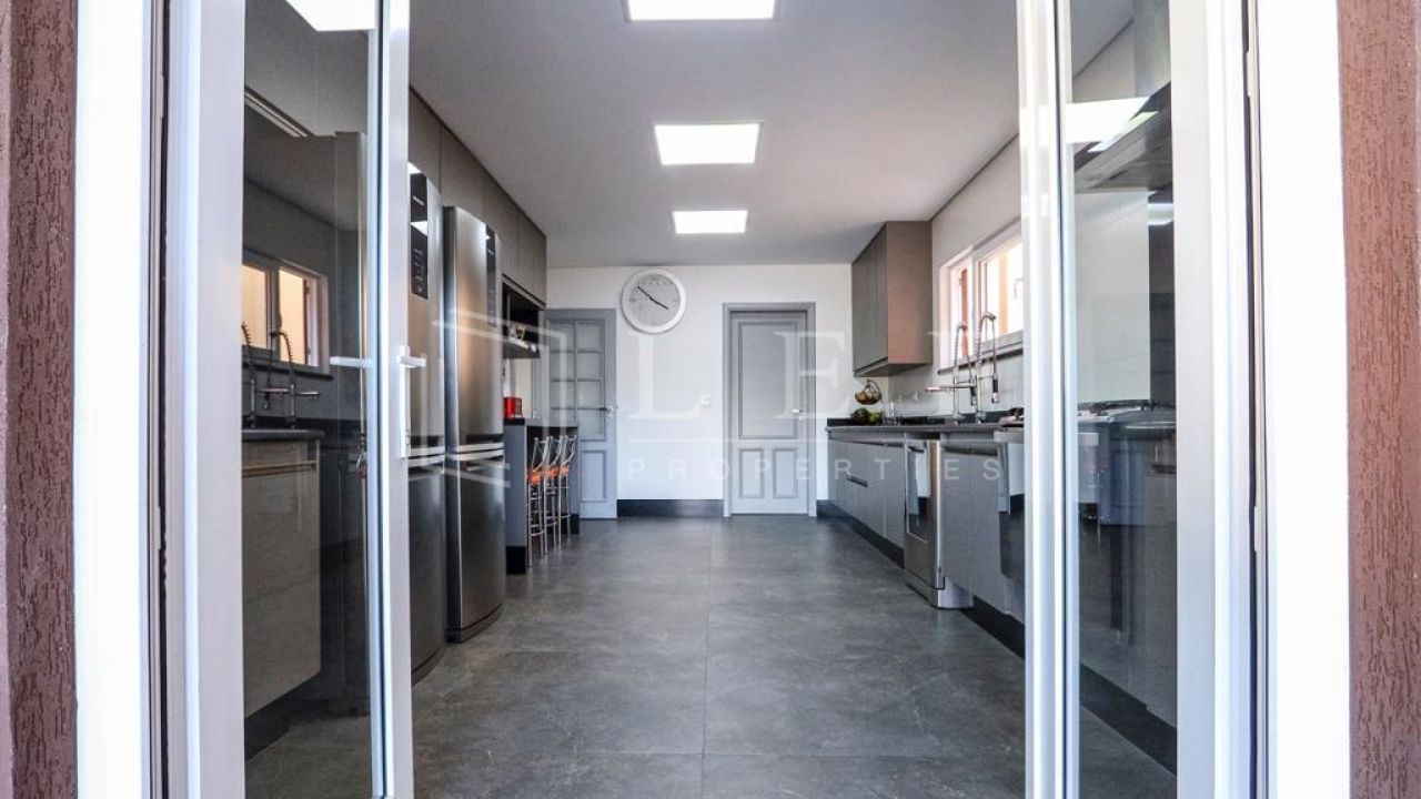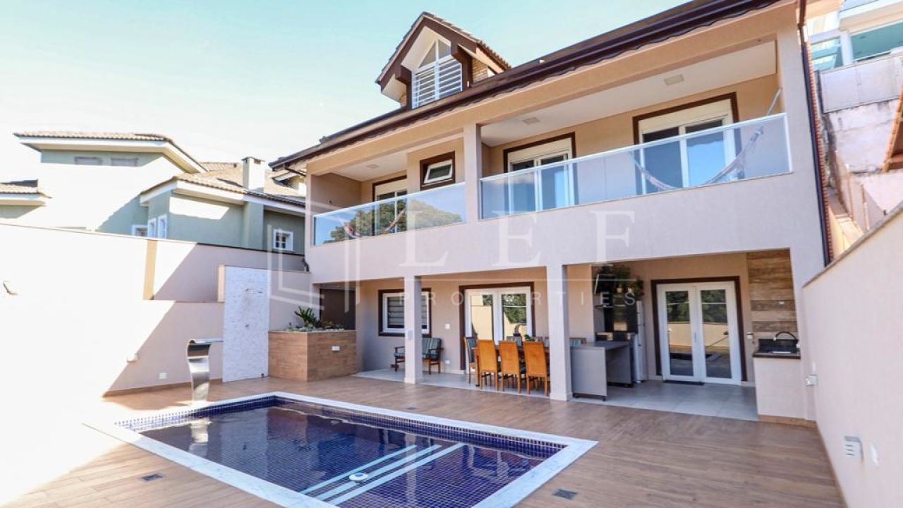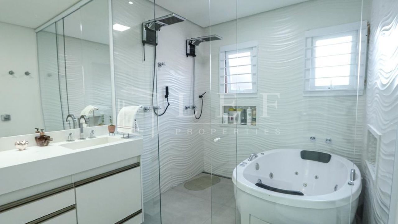 Casa dispõe de 4 suítes com varanda, sendo master com closet, hidromassagem e cromoterapia, living para 4 ambientes, lavabo, cozinha e área de serviços com suíte para empregada, totalizando 600m².