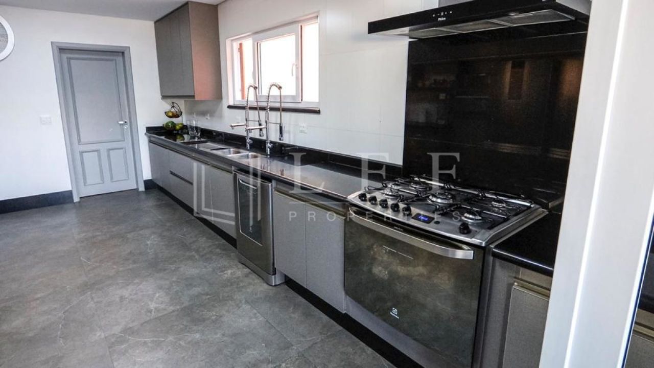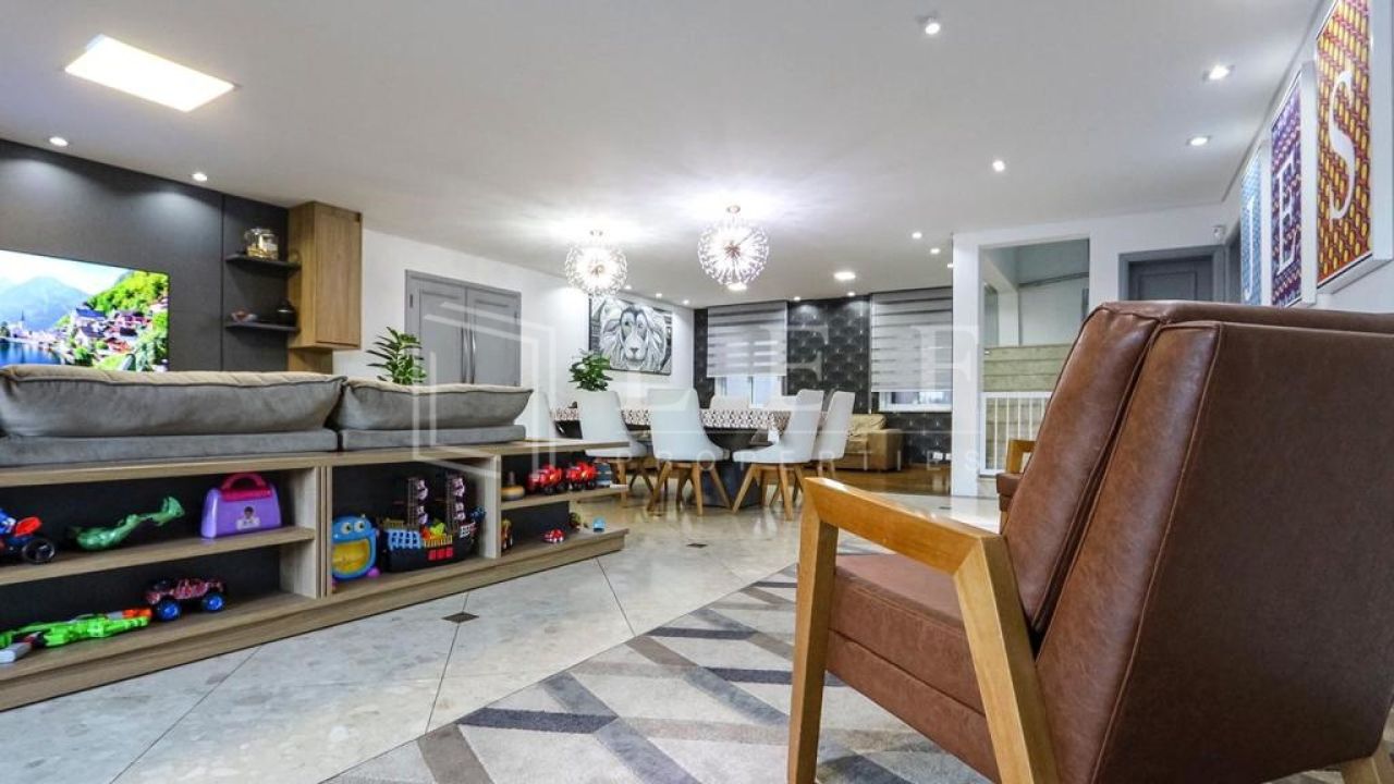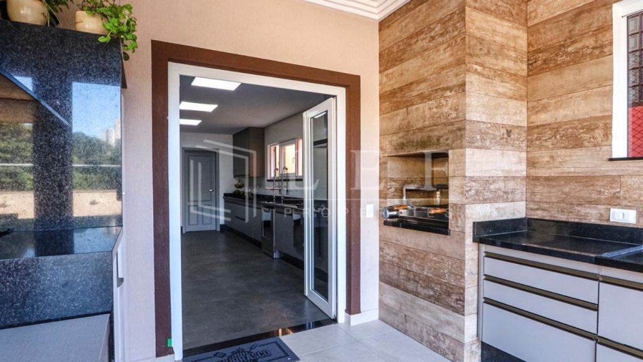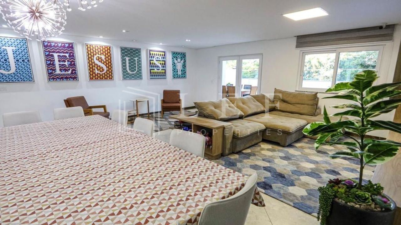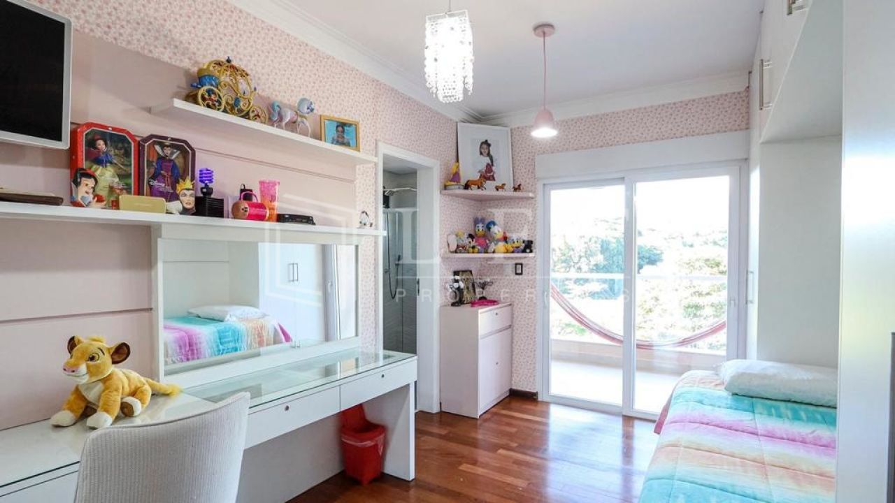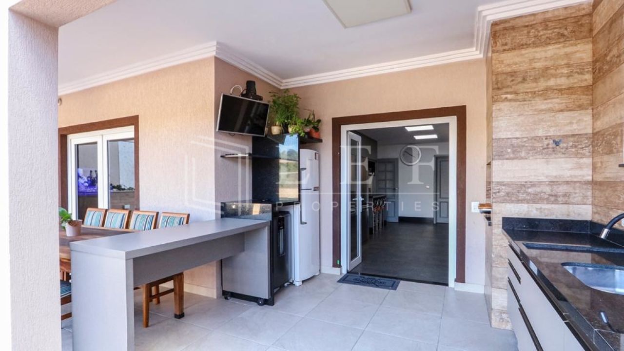 Casa dispõe de 4 suítes com varanda, sendo master com closet, hidromassagem e cromoterapia, living para 4 ambientes, lavabo, cozinha e área de serviços com suíte para empregada, totalizando 600m².