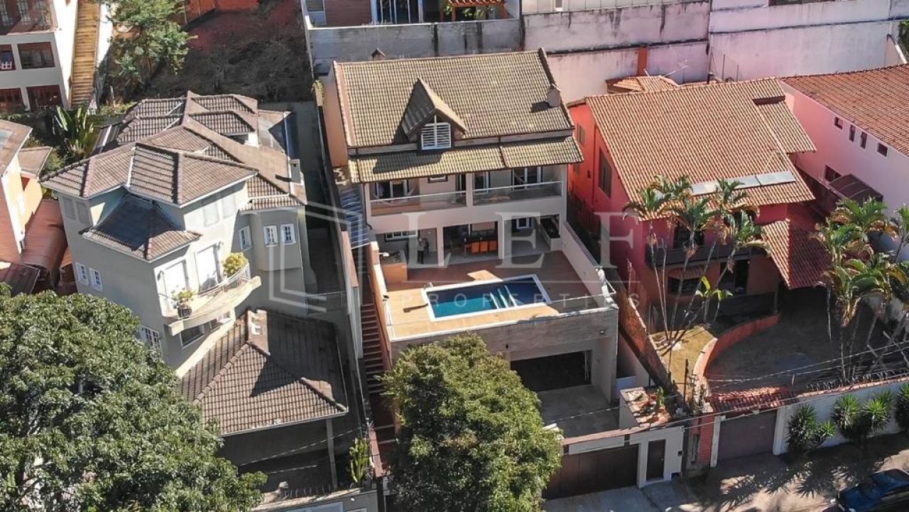 Área externa dispõe de 7 vagas de garagem, churrasqueira, área de lazer, piscina com aquecimento solar e cascata, quadra poliesportiva aberta e coberta para jogos de mesa, vestiário, depósito e sótão com 80m².