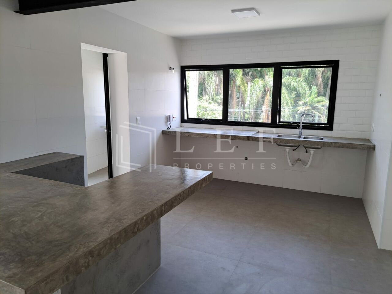 Churrasqueira, pia, e espaço para mobília externa, criando um ambiente perfeito para