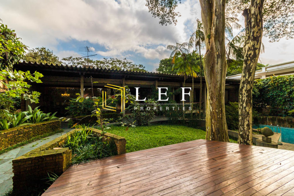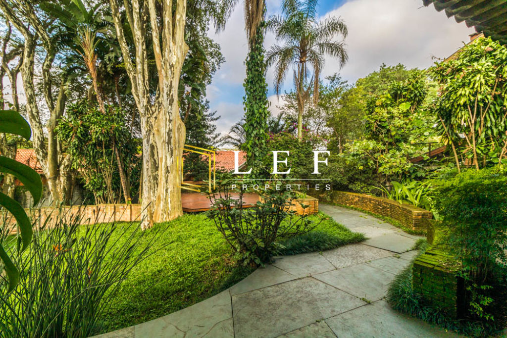 O jardim é amplo, com piscin e cheio de árvores.