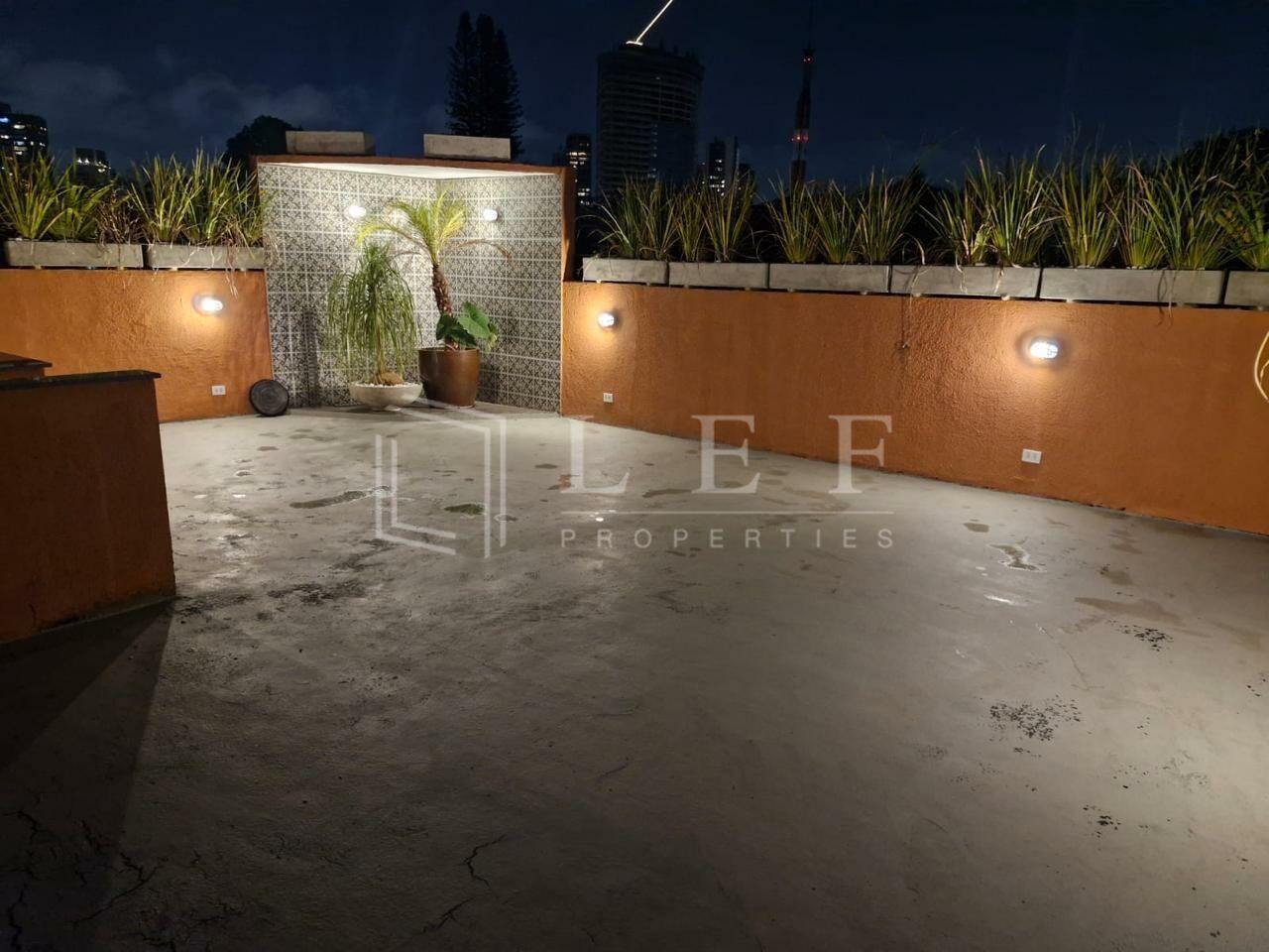 Terraço com vista e todo iluminado com decoração de plantas e luzes