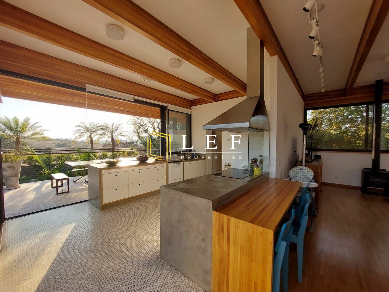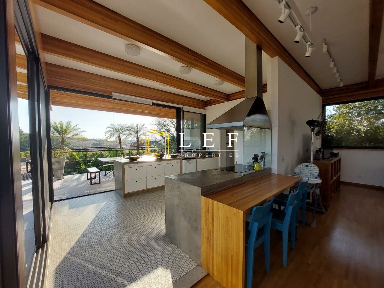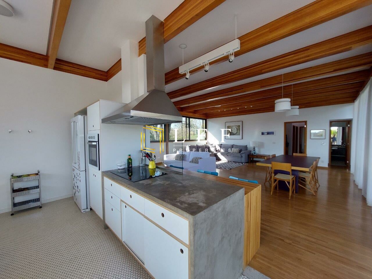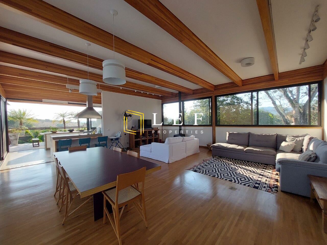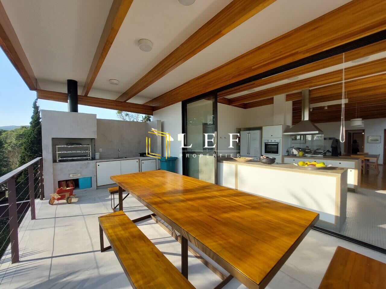 Possui 03 dormitórios (sendo 01 suíte), cozinha moderna integrada com sala de jantar e churrasqueira gourmet, amplo living com sala de estar e sala de som. Toda a casa é muito bem iluminada, com grandes portas de vidro e janelas, além de claraboias.