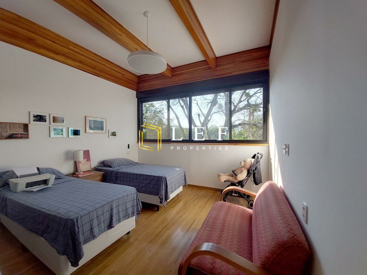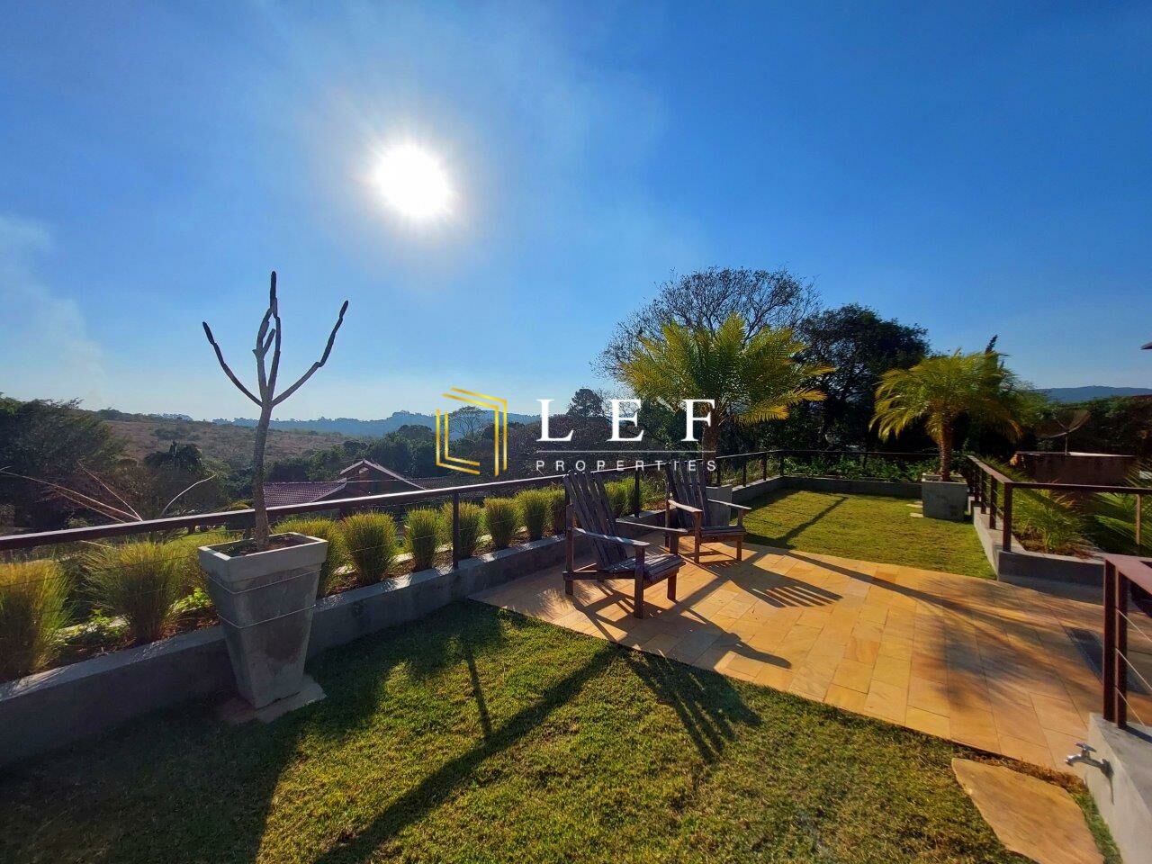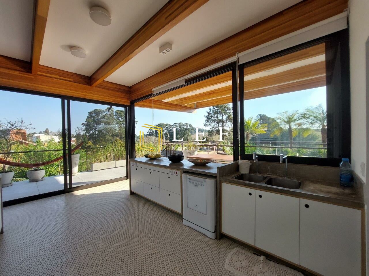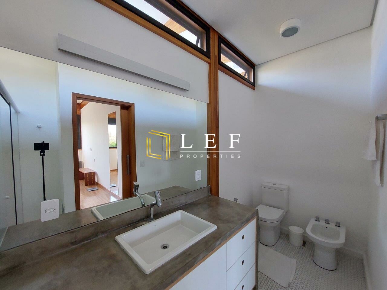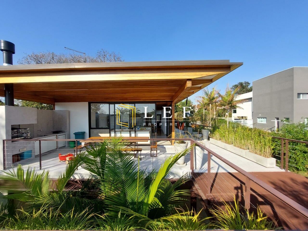 Os quartos possuem persianas automáticas e telas. A varanda da churrasqueira/cozinha possui um mirante, onde fica o telhado verde da 2ª casa.