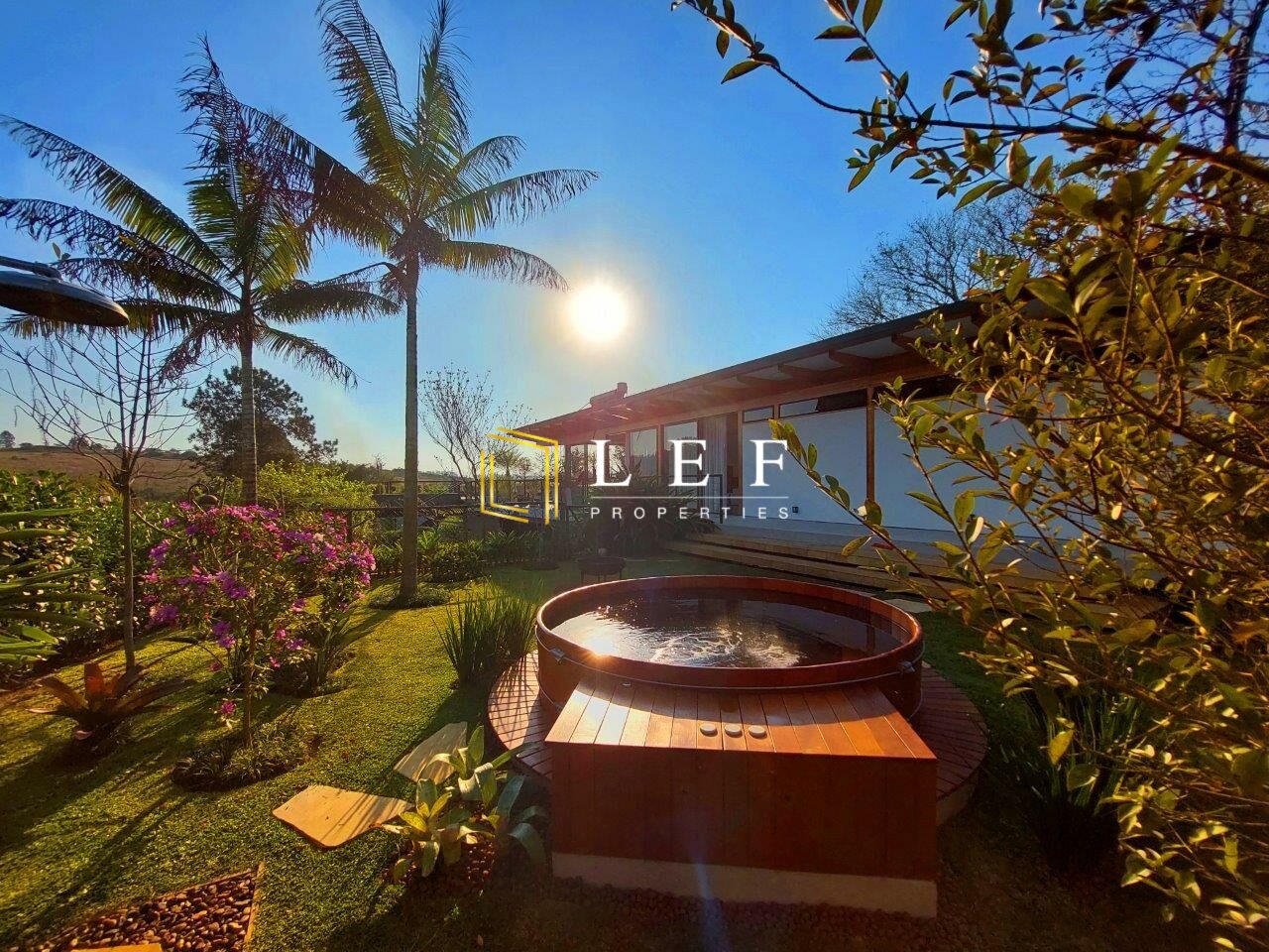 A área externa, com belo projeto paisagístico, possui um ofurô de 2.5 metros de diâmetro (para até 12 pessoas confortavelmente). Oferece ainda horta orgânica, árvores frutíferas em produção, telhado verde, jardim interno, redário, ducha, cisterna de 17.000 litros de captação de água da chuva e aquecimento de água com energia solar.