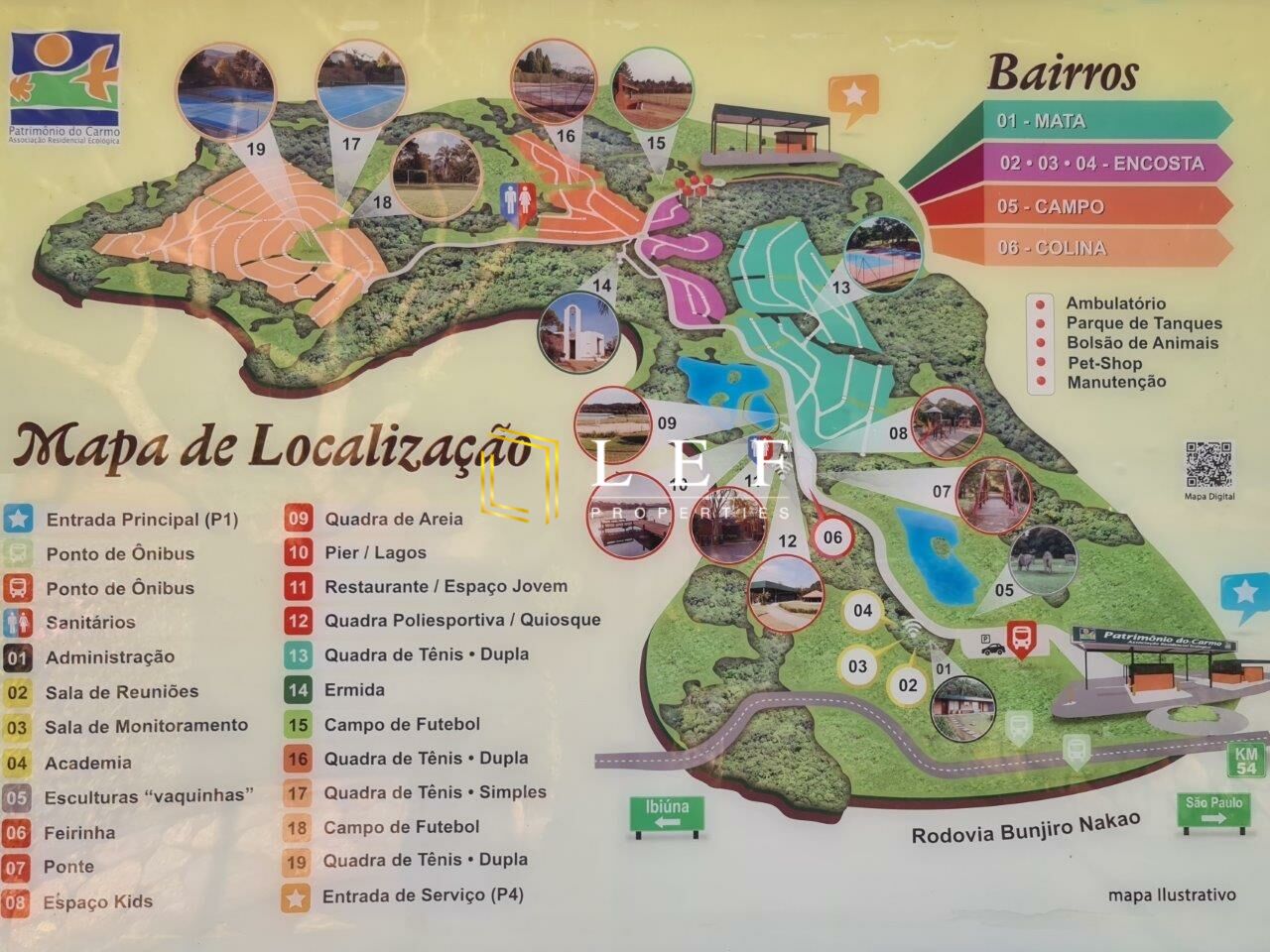 O condomínio possui uma infra de lazer com quadras de tênis, campo de futebol, quadra de vôlei de areia, quadra de futsal coberta, play ground, quiosque com churrasqueira, academia de ginástica com professores, pista de motocross, pista de caminhada, lagos com deck, restaurante, ronda e segurança armada, ambulatório com ambulância, internet fibra e Wi-Fi.