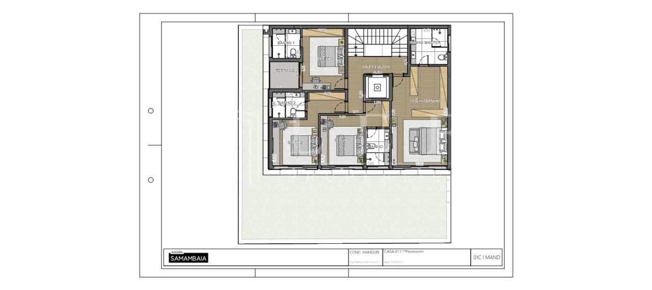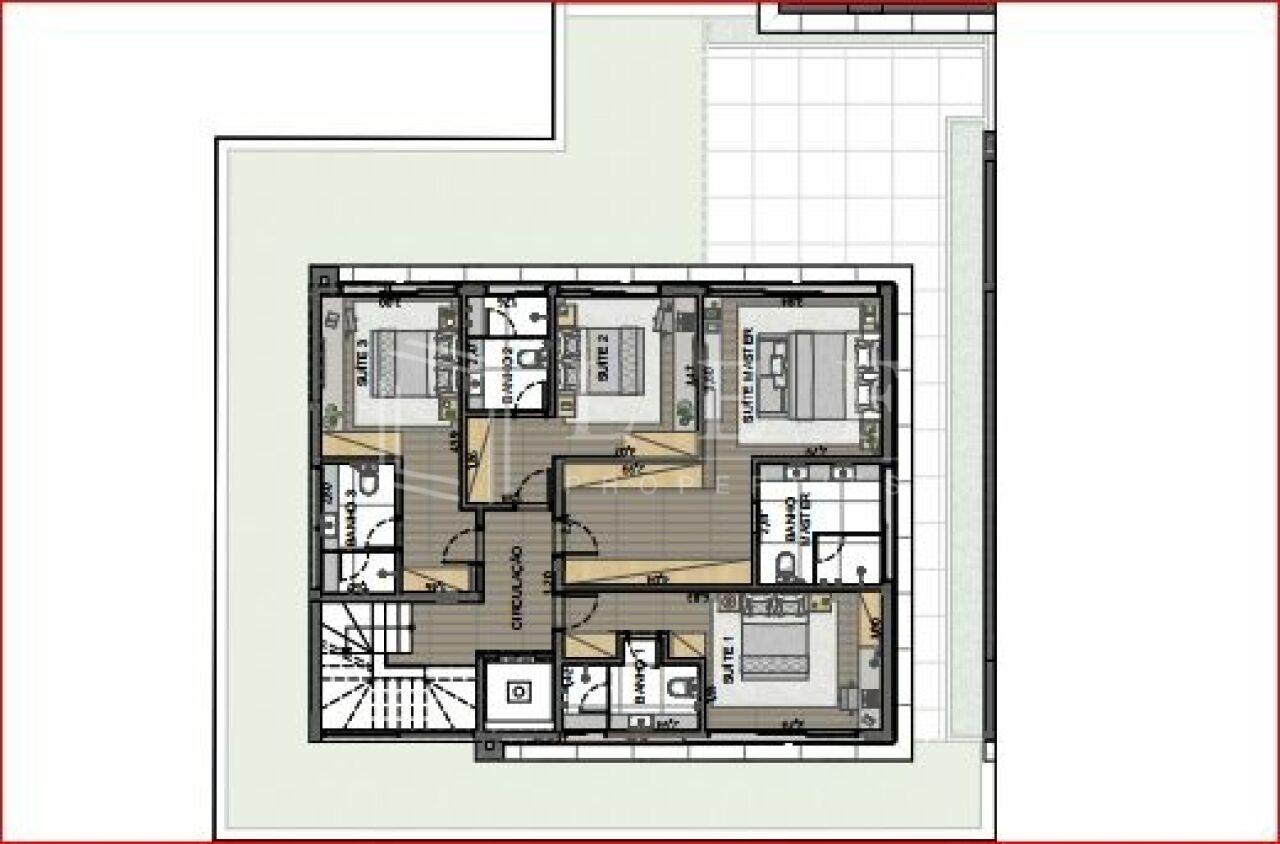 Superior: 04 suítes, sendo uma máster, hall com elevador privativo.